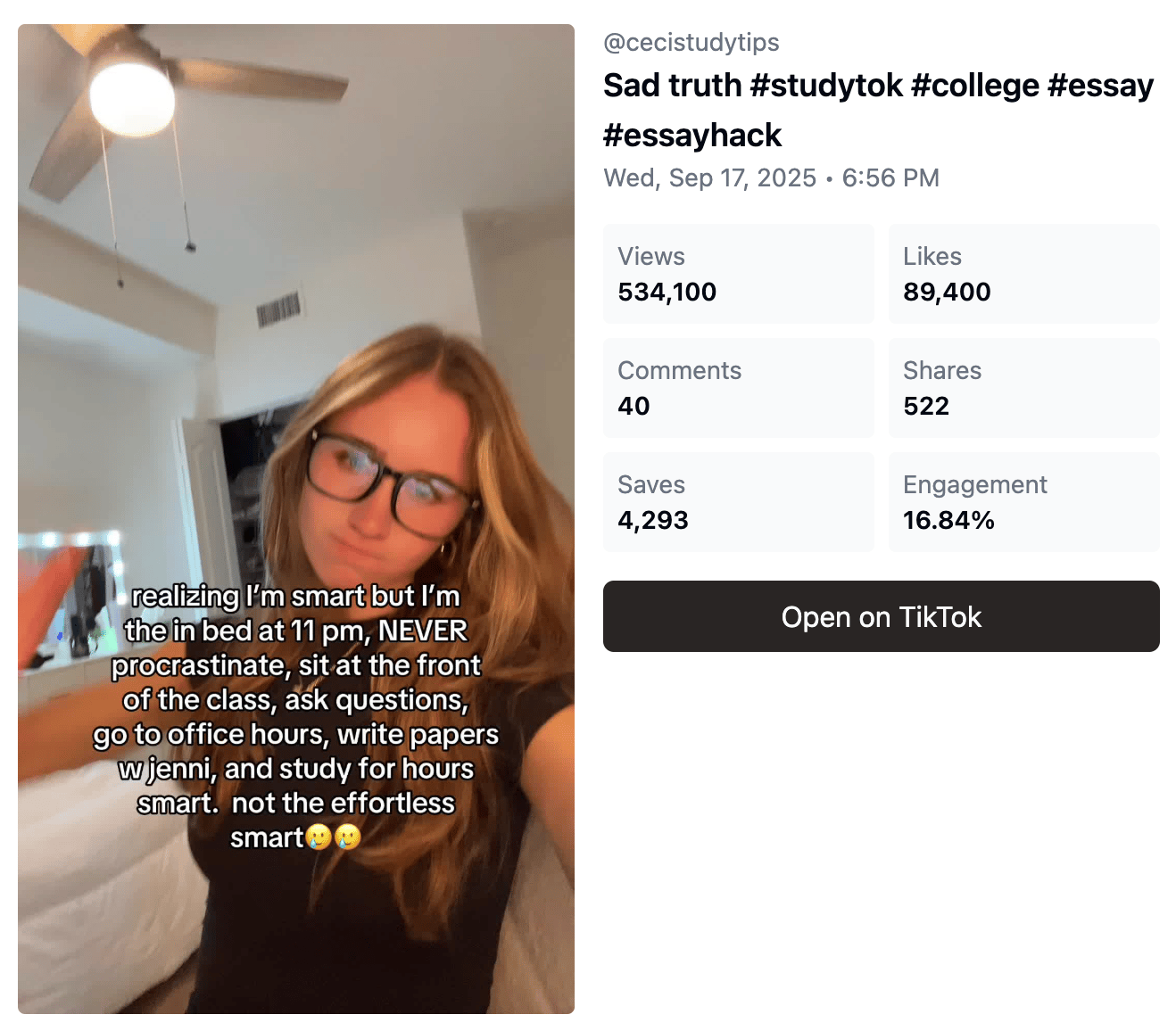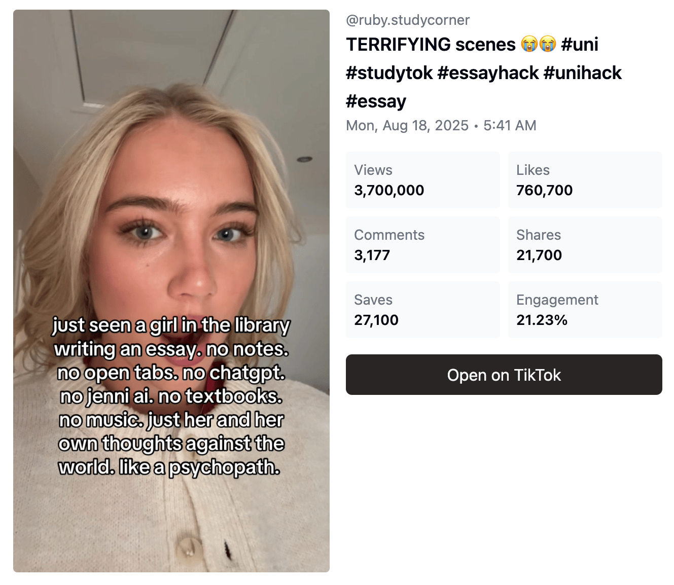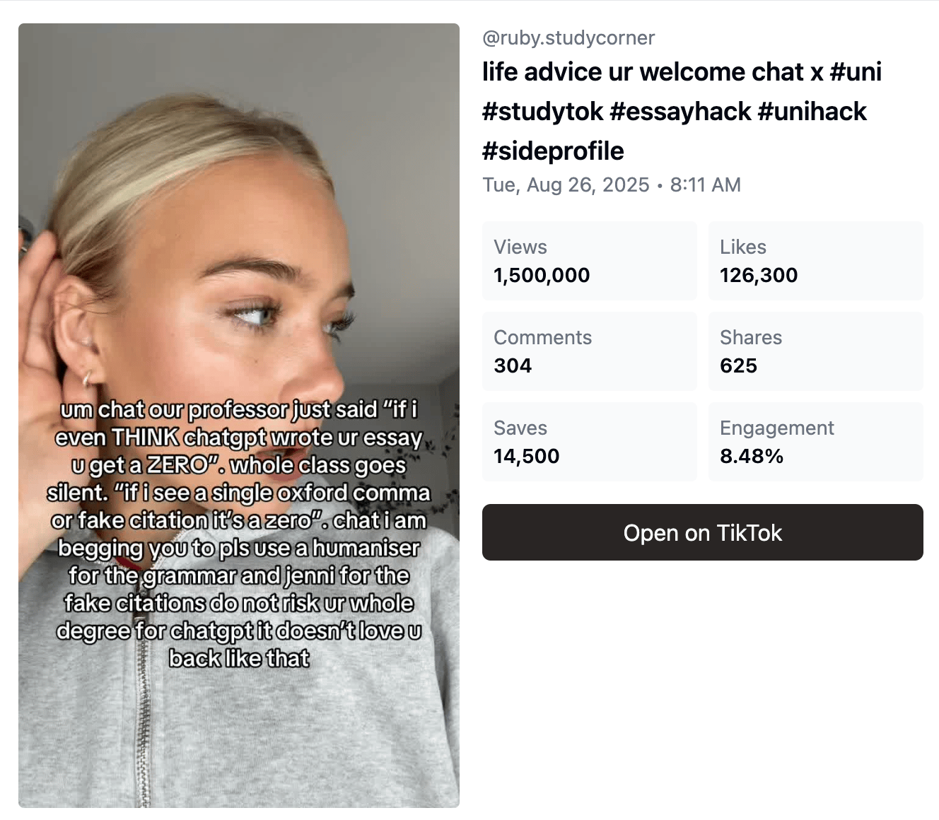 Polarising Piece - Nature of the content invites engagement from people who didn’t use AI for assignments and those who do. Leads to an above average engagement on the tiktok.